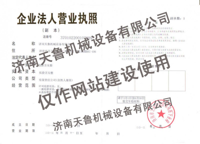 证书介绍 济南天鲁机械设备有限公司创建于2003年,一直致力于包装设备的设计、制造与销售,是国内专业从事自动化包装机械的产品集研发、生产、销售、服务于一体的制造公司,是包装协会会员单位,公司产品已通过ISO9001:2000体系认证, 主要产品如:食品包装机、封口机、灌装机、贴标机、喷码机、打包机、洗碗机、灌装封尾机等数十种包装机产品。产品已在制药、日化、化工、食品、 农药、润滑油等行业广泛使用。